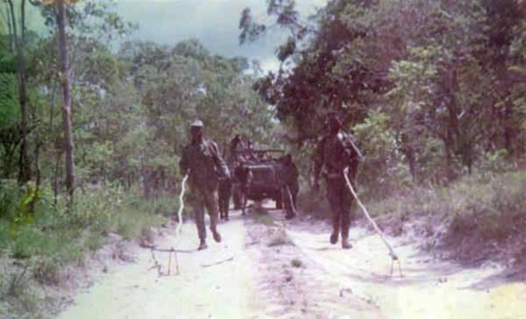 que seguia na dianteira da picada, de ambos os lados do rodado das viaturas. Os