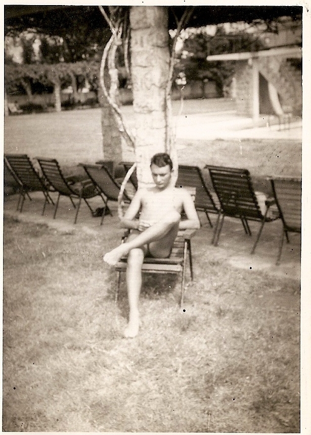 numa cadeira junto á piscina, quando sinto tocarem-me nas costas e volto-me imediatamente dou por um jovem mais ou menos